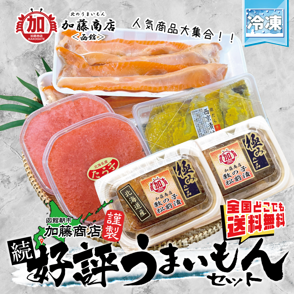 函館朝市加藤商店謹製 続・好評うまいもんセット【全国送料無料】<冷凍> 燻製サーモンハラス 鮭 数の子 松前漬け 大人気 銀だら西京漬け 大好物 たらこバラコ 北海道 うまいもん